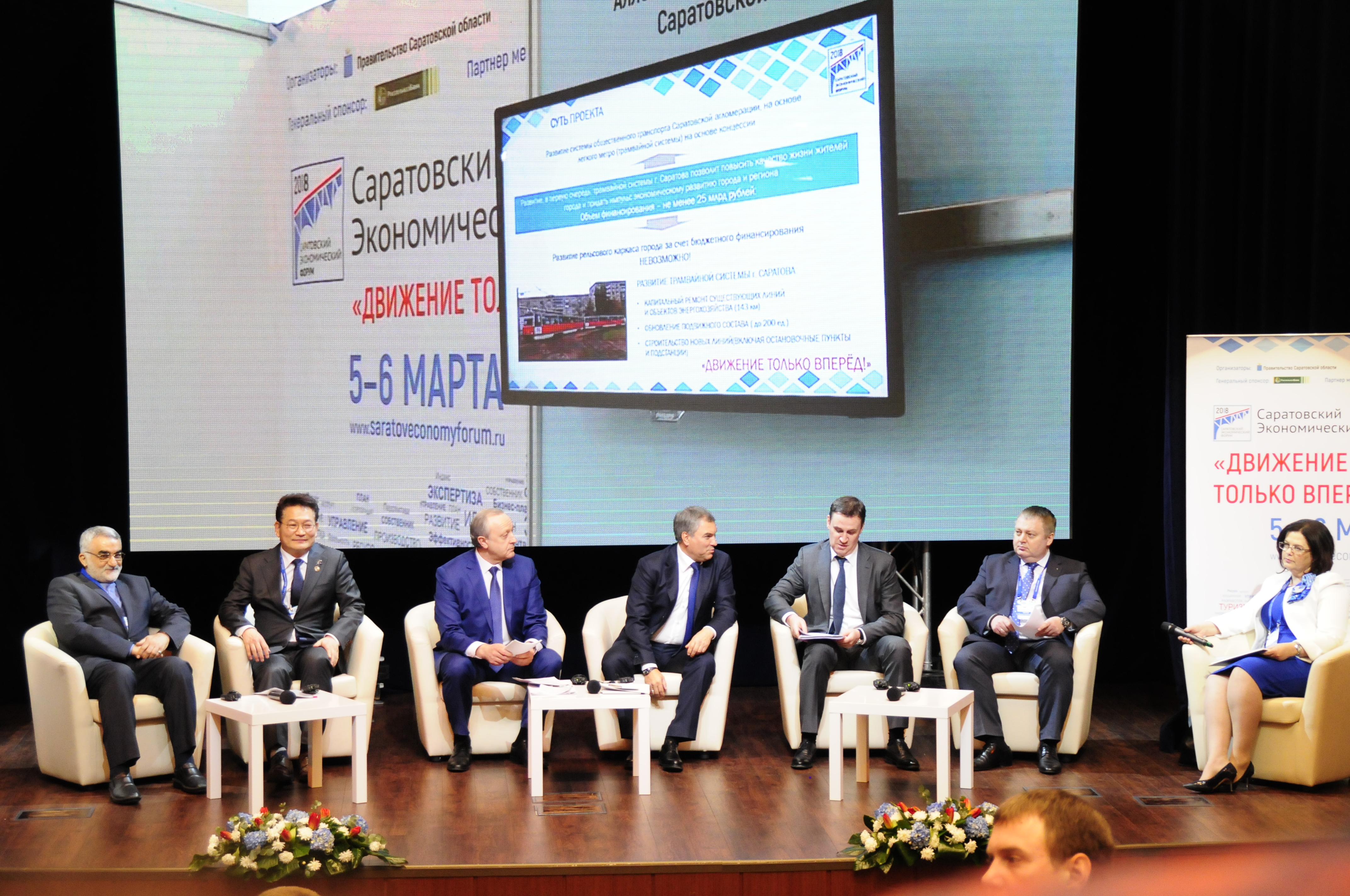 Пленарное заседание второго дня экономическом форума «Движение только вперёд» открыл губернатор Валерий Радаев. Он подвел итоги первого дня работы, рассказал о готовящемся проекте скоростного трамвая, заключенных договорах с «КАМАЗ» и Русской холдинговой компанией (по строительству дороги из Казахстана в Беларусь). Не обошел вниманием планы по созданию новых распредцентров и 130 магазинов одной из ведущих российских мультиформатных продуктовых розничных компаний «Х5», подготовку «МегаФон» к расширению охвата связью села, проект саратовской агломерации и Фонд Поддержки Технологического Образования по строительству предуниверсария.
